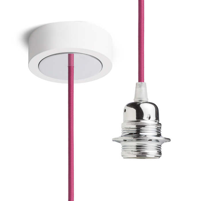 Aufhängeset mit lackiertem Aluminiumbasis E27-Metallfassung und Textilkabel. Zur alleinigen Verwendung oder zum Aufhängen leichter Lampenschirme. Geeignet für Lampenschirme: ARISTA DELI JAKARANDA DOUBLE 40/30 DOUBLE 55/30 ASPRO 40/30 RON 40/25 RON 55/30 RON 60/19 TEMPO 30/19 TEMPO 50/19.