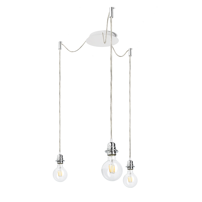 Pendelleuchte mit zentraler Deckenbasis und drei Textilsarmen mit Metallsockel zur Deckenbefestigung E27-Fassung zur Verwendung mit geeigneten Textilschirmen. Das Stoff-Pendelset wird mit vechromten Deckenhaltern geliefert die in einem individuellen Abstand von der Basis installiert werden können. Kabellänge 3 m. Für Schirme: ARISTA DELI JAKARANDA DOUBLE 40/30 DOUBLE 55/30 ASPRO 40/30 ASPRO 55/30 RON 15/20 RON 40/25 RON 55/30 TEMPO 15/30 TEMPO 30/19.